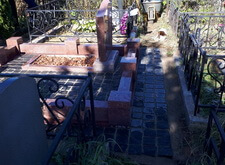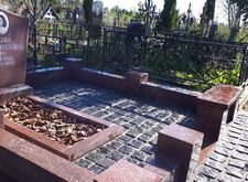 Облицевали бетон полированным гранитом, на территорию участка уложили брусчатку, предварительно приподняв памятник.